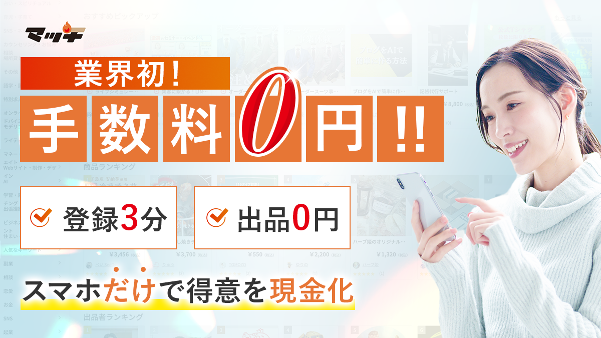 登録・出品・手数料がすべて0円で今すぐ始められる、新しいカタチのスキルシェアプラットフォームです。